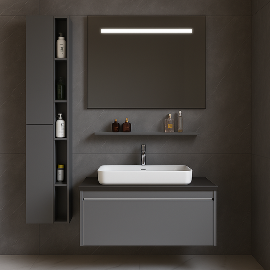 Moderní koupelnový nábytek, s minimalistickým a funkčním designem. Sady se zavěšenými skříněmi, zrcadlem a dřezem, k dispozici v různých rozměrech. Mnoho modelů zahrnuje řešení LED a měkkých zásuvek-kompletních řešení pro elegantní a organizovanou koupelnu.
