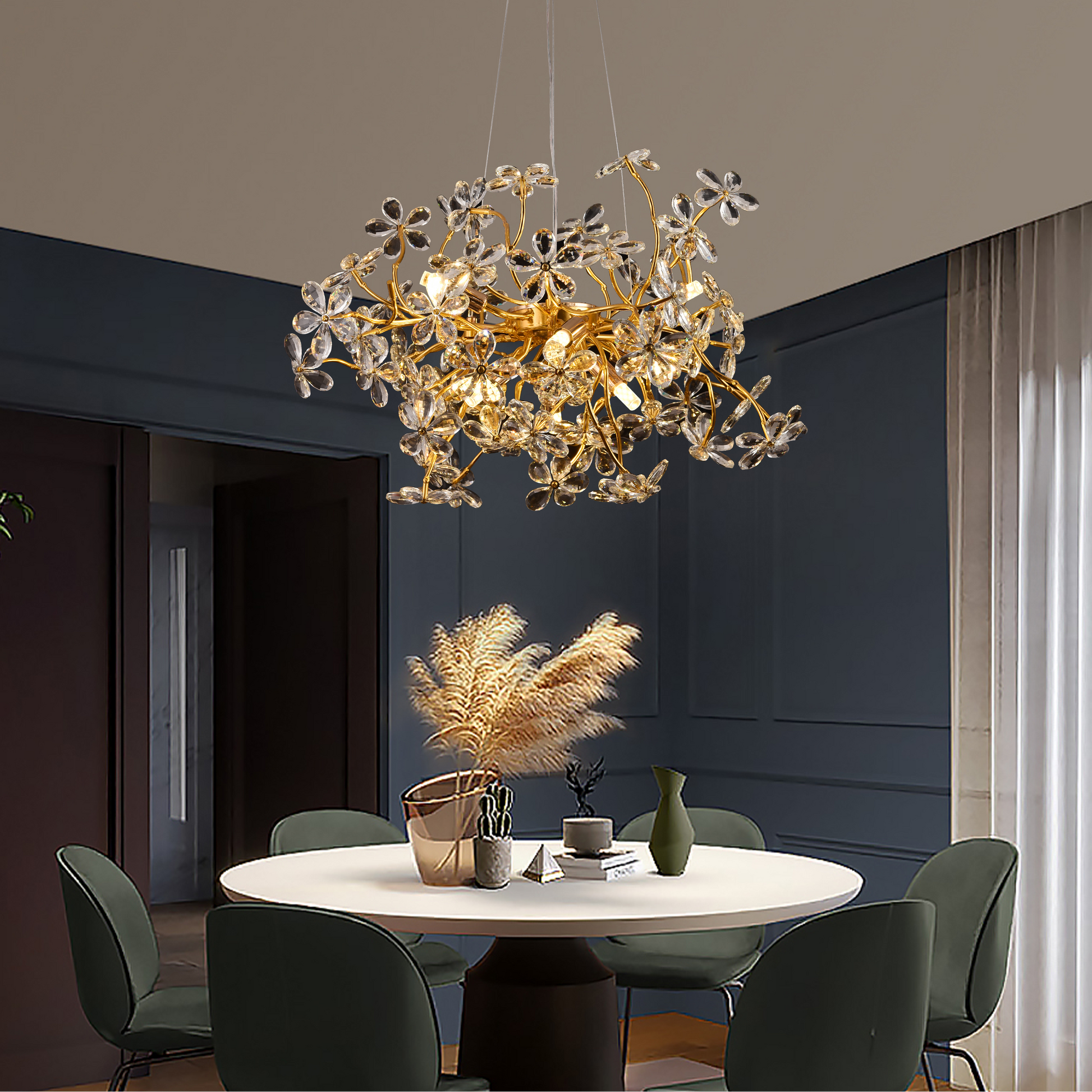 S průměrem 55 cm, chromovanou povrchovou úpravou a křišťálovými dekorativními prvky vytváří lustr velkolepé odlesky a dodává prostoru extra jiskru. Nastavitelná výška umožňuje snadné přizpůsobení různým typům stropů a mění CM325/600GD na elegantní a dobře proporcionální ohnisko.