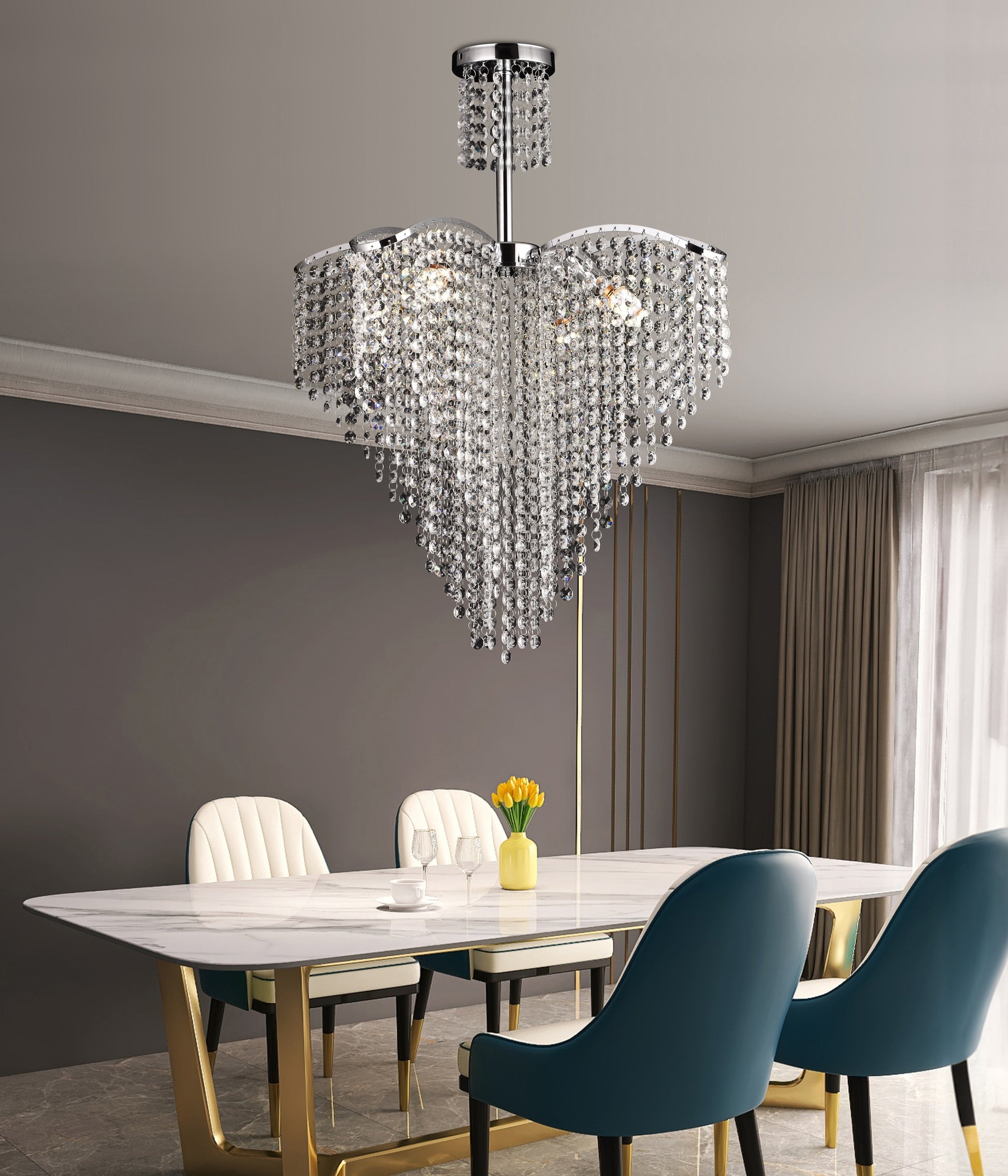 Poskytuje eleganci vašemu pokoji prostřednictvím tohoto zvláštního lustru. Zdroje světla jsou obklopeny ozdobnými vlákny s působivým počtem krystalů. Jakmile je lustr osvětlen, světlý odraz pečlivě umístěnými krystaly vytváří jedinečný, estetický mimořádný zdroj.