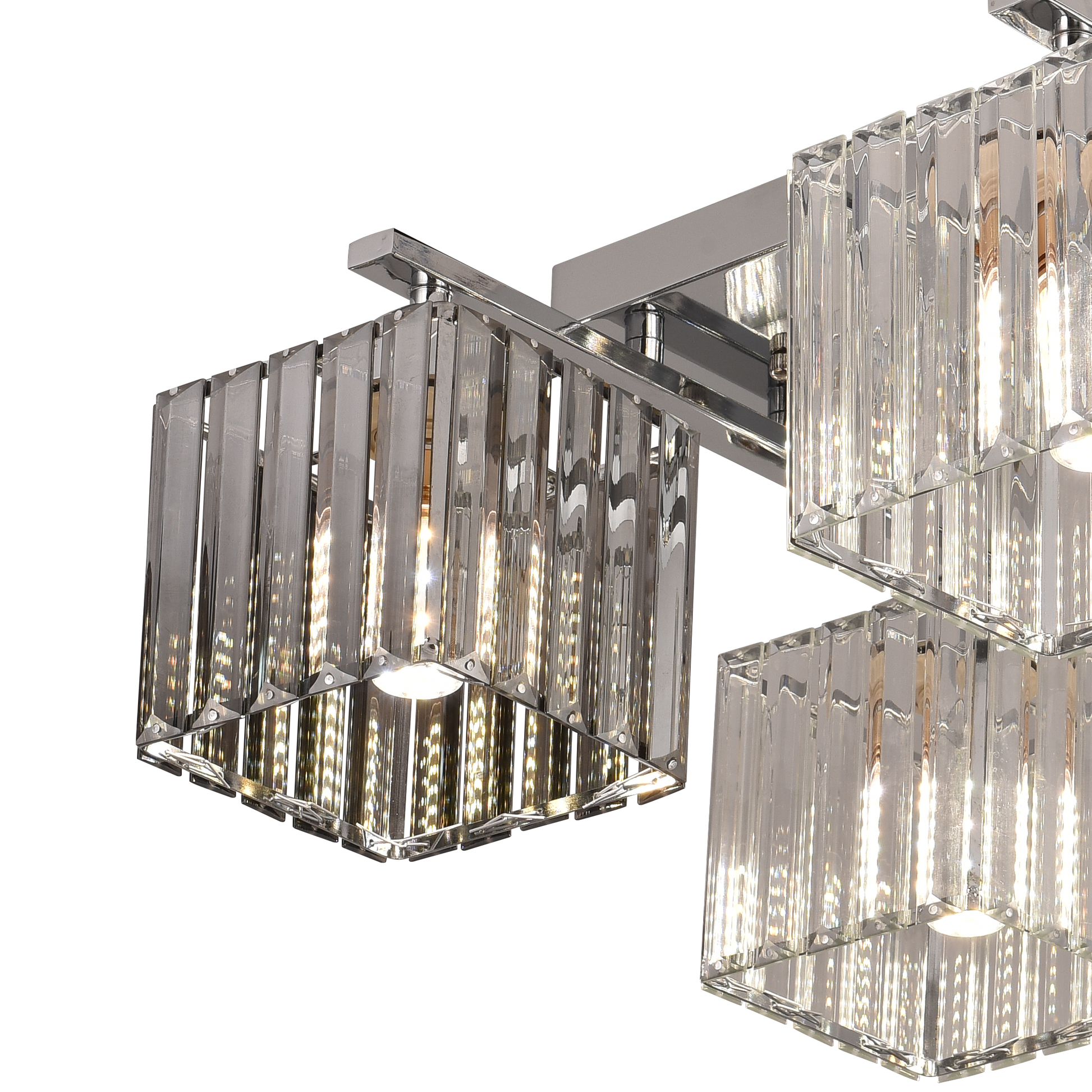 Moderní design s luxusními akcenty: Kovová konstrukce s lesklým chromovým povrchem je doplněna geometrickými skleněnými odstíny, které sofistikovaným způsobem odrážejí a lámou světlo. Jeho čistý a světlý vzhled dodává prostoru hloubku a umocňuje pocit světla a řádu.