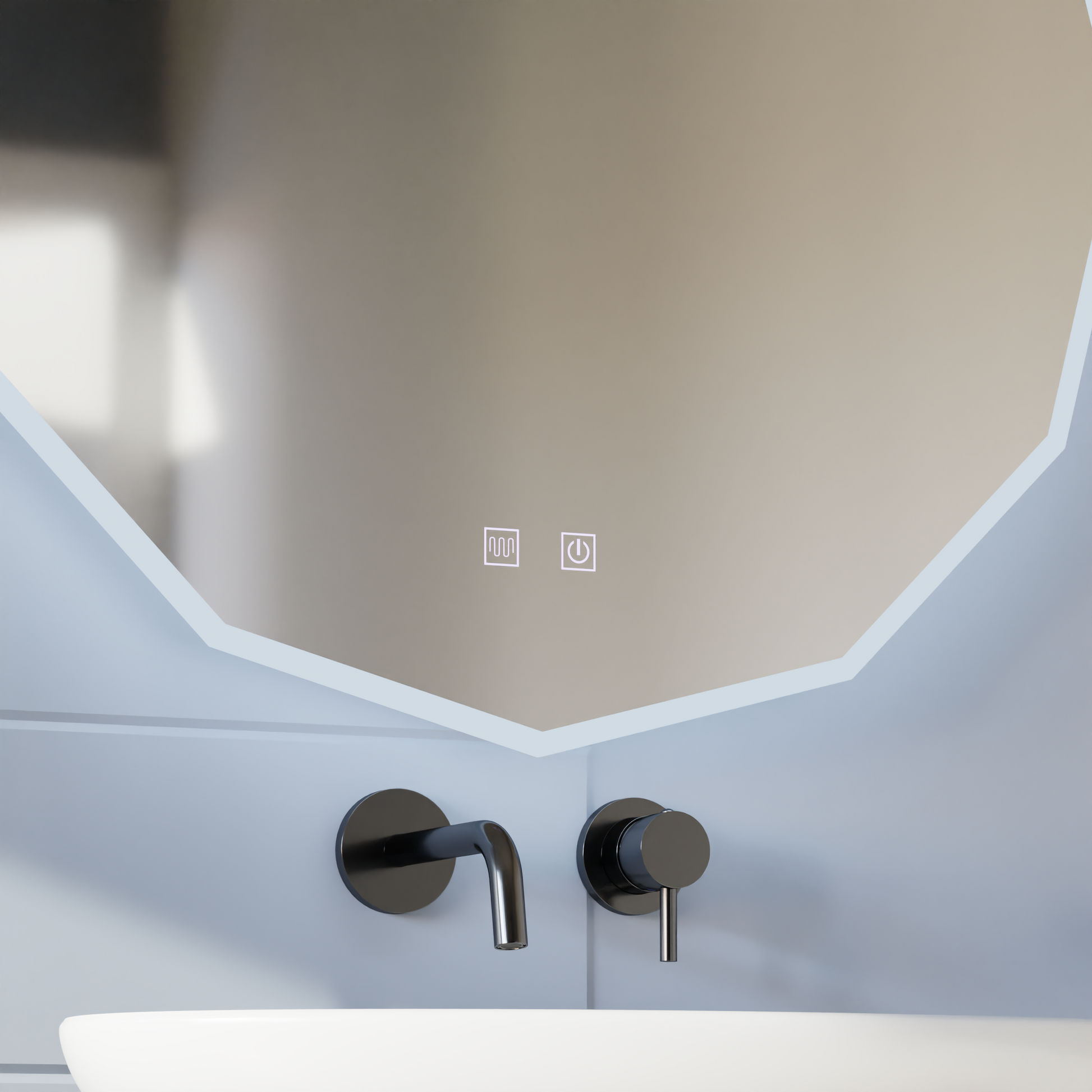 Ovládací prvek „Touch“ ukazuje, že zapnutí/vypnutí světla a případně další funkce (jako je intenzita světla, je-li stmívatelná) jsou dosaženy dotykem určité oblasti na zrcátku.
