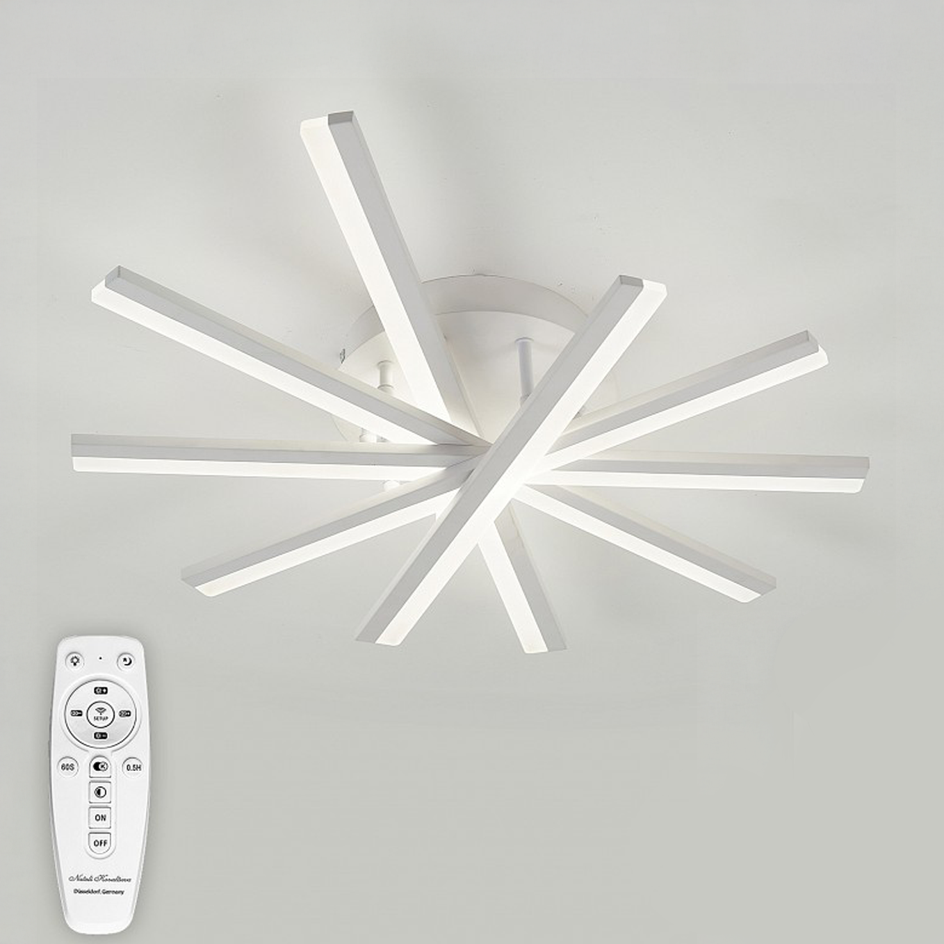 Tento moderní LED lustr se svým dynamickým geometrickým tvarem a matným bílým povrchem přináší elegantní architektonický akcent do každého současného interiéru. Je navržen pro funkčnost a flexibilitu a je vybaven dálkovým ovládáním, které umožňuje nastavení teploty barev a intenzity světla a dokonale se tak přizpůsobí jakémukoli okamžiku dne.