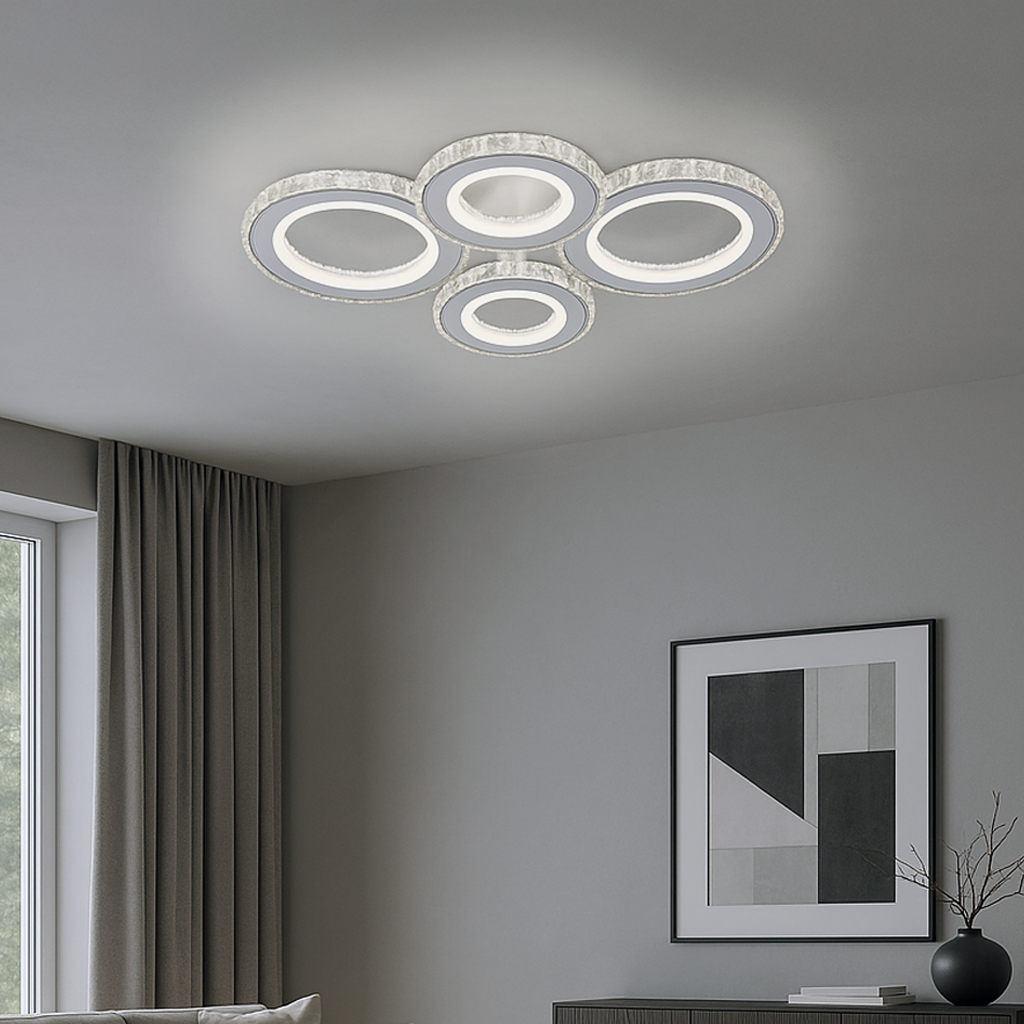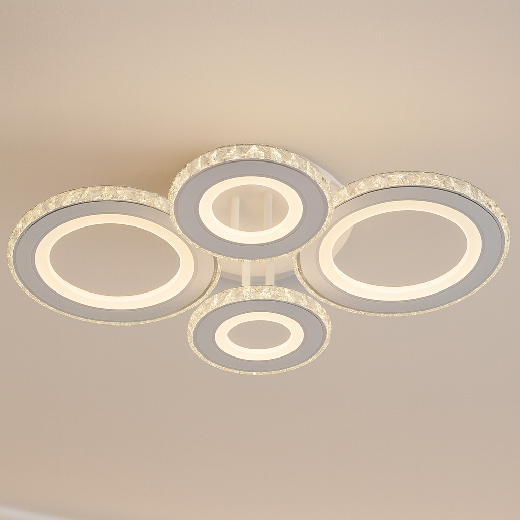 LED lustr s dálkovým ovládáním a krystalem NOVA ROTONDA RGB 86W, 4 kruhy, Studené/Teplé/Neutrální světlo, Stmívatelné, Bílá