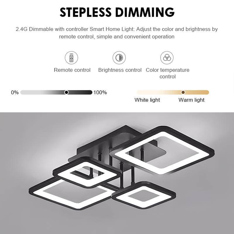 LED lustr s dálkovým ovládáním ELLA 85W, 4 čtverce, studené/teplé/neutrální světlo, stmívatelné, černá