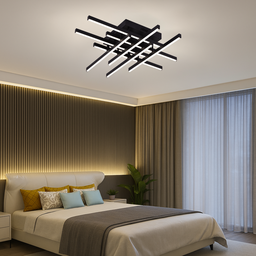 LED lustr s dálkovým ovládáním LINEX, model s 8 rameny, má sílu 90W a světelný tok 7200 lm, poskytující světlo Stmívatelné s volitelnými teplotami: 3000K, 4000K, 6000K (teplý, neutrální, studený). Funguje na 220–230V, s autonomií 25 000 hodin, a je ovládán dálkový ovladač nebo klasický vypínač. Má design lineární, montáž aplikovaný na strop, vyrobený z kov a akryl, dokončit černý. Rozměry: 62 cm dlouhé, 23 cm široký, 13 cm vysoký. Ochrana IP20, jídlo do sítě. Doporučeno pro ložnice, obývací pokoj nebo hala.