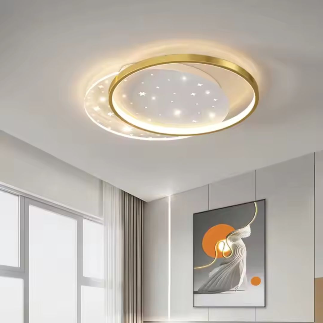 S moderním kruhovým designem a teplým zlatým povrchem, MĚSÍČNÍ přináší extra dotek sofistikovanosti a vyváženého světla do každé místnosti. Dva propojené kruhy poskytují vzdušný vizuální efekt, ideální pro elegantní nebo moderní prostory.