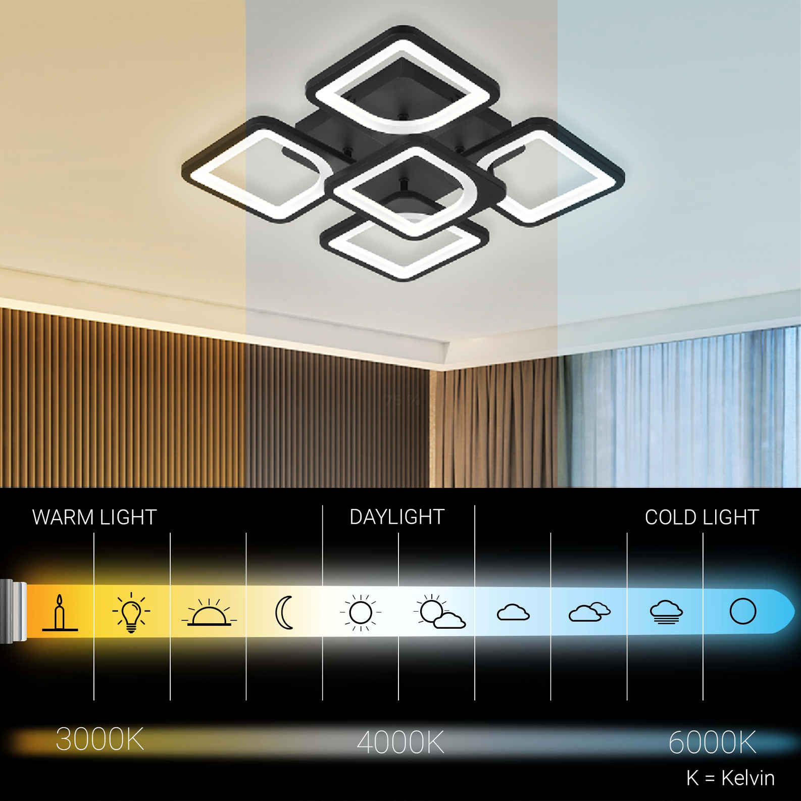 Pět čtverců, uspořádaných pravděpodobně tak, že vytváří zajímavý vizuální celek, je osvětleno LED diodami s možností volby teploty barev. Pomocí dálkového ovládání si můžete vybrat mezi studeným světlem (pro energizující prostředí), teplým (pro příjemnou a relaxační atmosféru) nebo neutrálním (pro celkové osvětlení). Funkce stmívání umožňuje nastavit intenzitu světla tak, aby dokonale vyhovovala každému okamžiku.