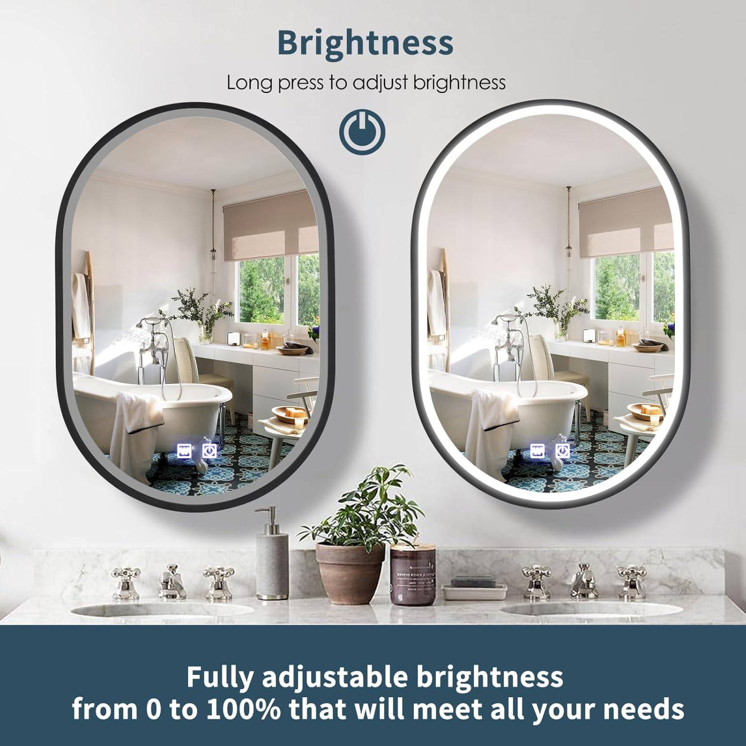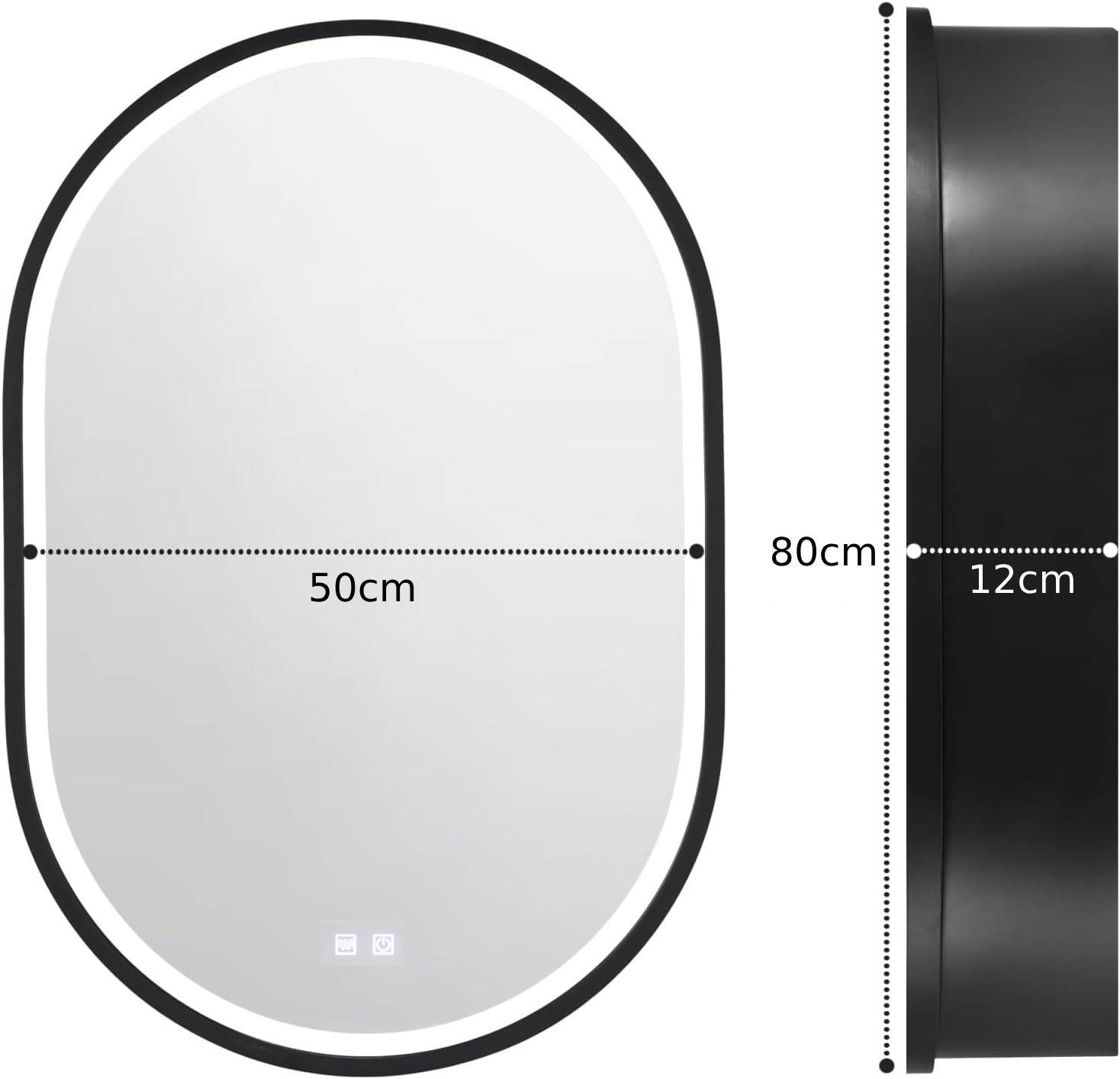 LED zrcadlo se skříňkou, oválné, 50x80 cm, odmlžování, studené/teplé/neutrální světlo, černý rám, úložný prostor