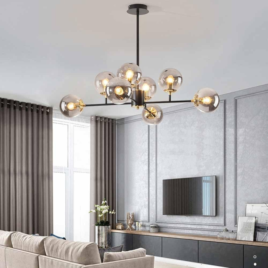 Design s 8 žárovkami naznačuje velkorysou kapacitu osvětlení, vhodnou pro středně velké až velké prostory. Stínidla budou hrát důležitou roli při usměrňování a rozptylování světla a vytvářejí specifickou atmosféru v závislosti na jejich materiálu a tvaru.