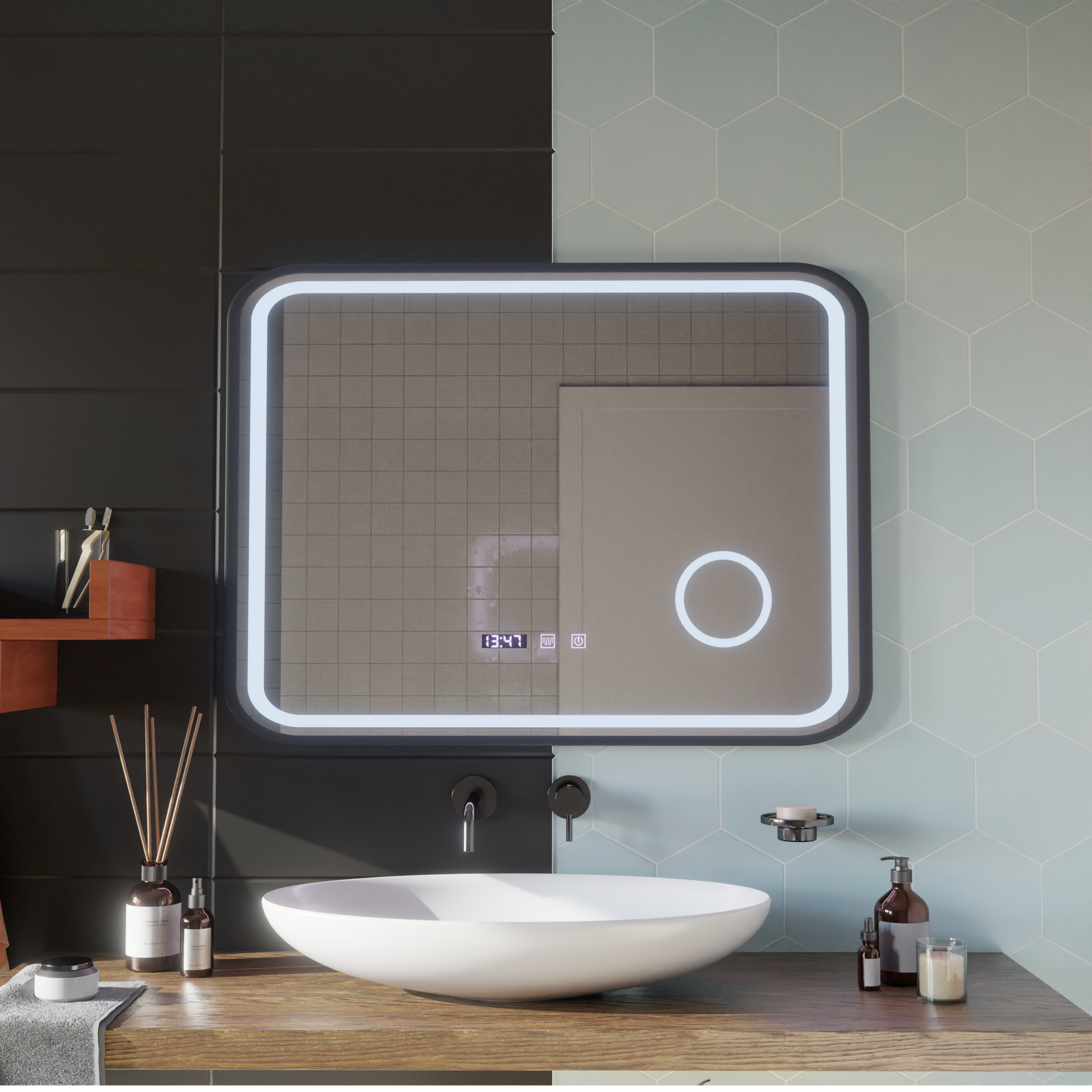 Mirror LED LED Touch Bernd Dezoringový systém, hodiny a teplota 80x60 cm fond Black Brush Cosmetica