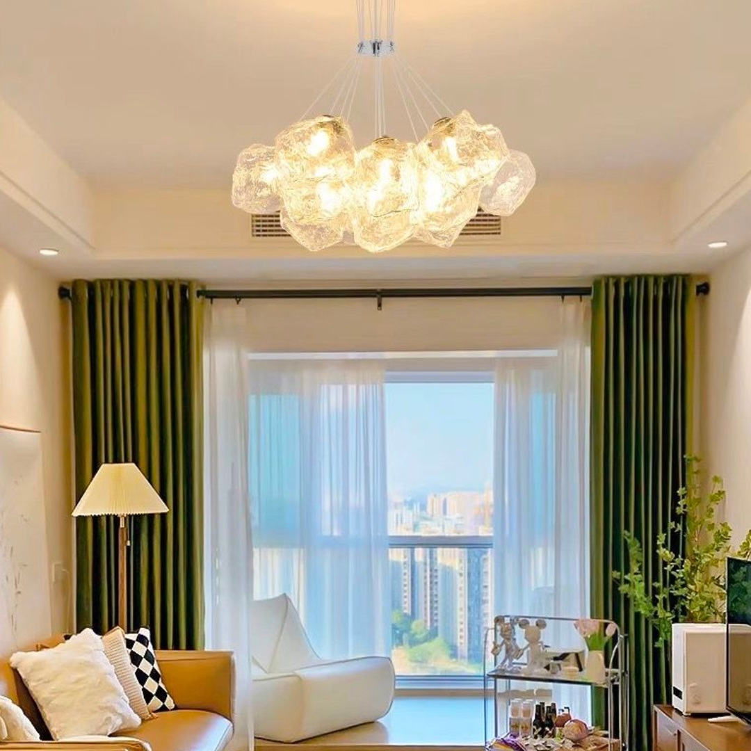 Tento lustr s žárovkou je vybavena 13 zásuvkami E27, je ideální pro velké místnosti, jako jsou obývací pokoje nebo prostorné ložnice. Závěsný design s průhlednými skleněnými koulemi vytváří vzdušný vizuální efekt a zajišťuje rovnoměrné rozložení světla.