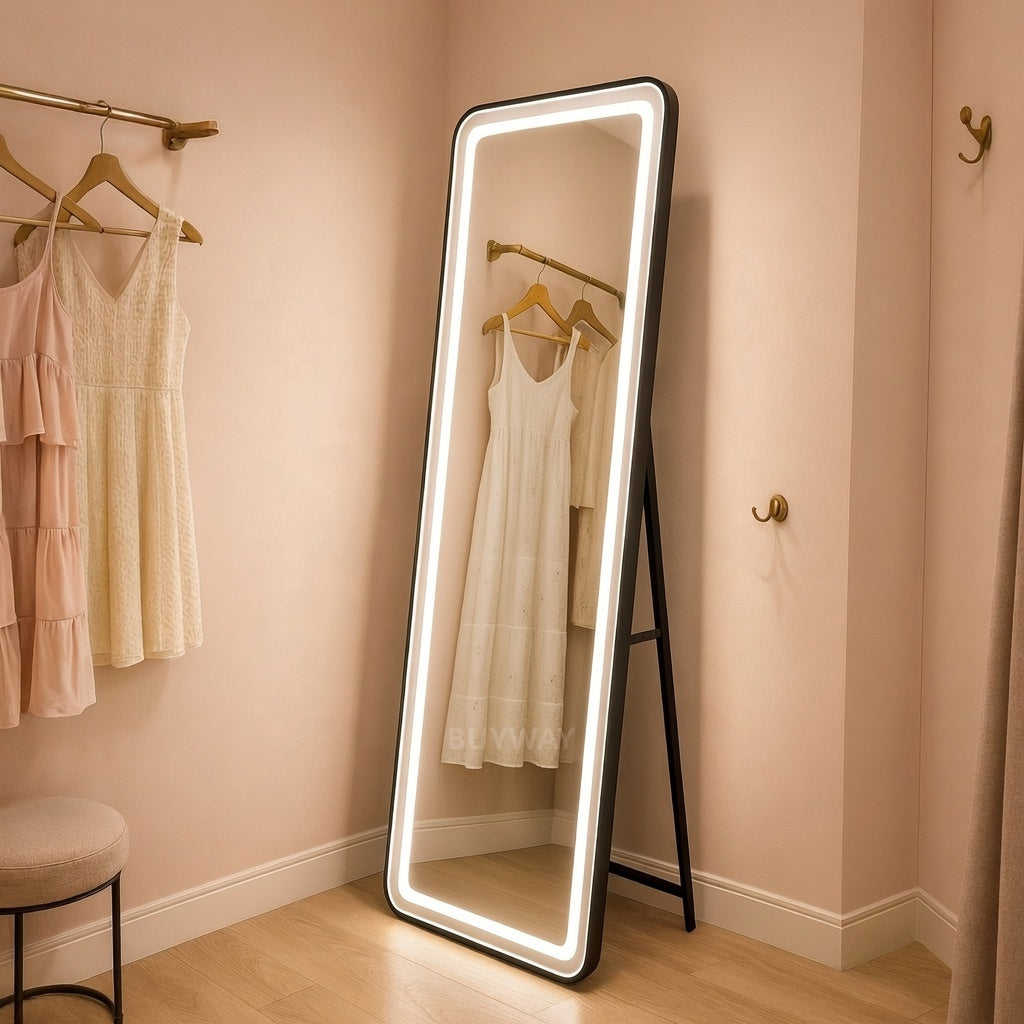 Obdélníkové LED zrcadlo, černý rám, 50x160 cm, stmívatelné, studené/teplé/neutrální světlo, župan