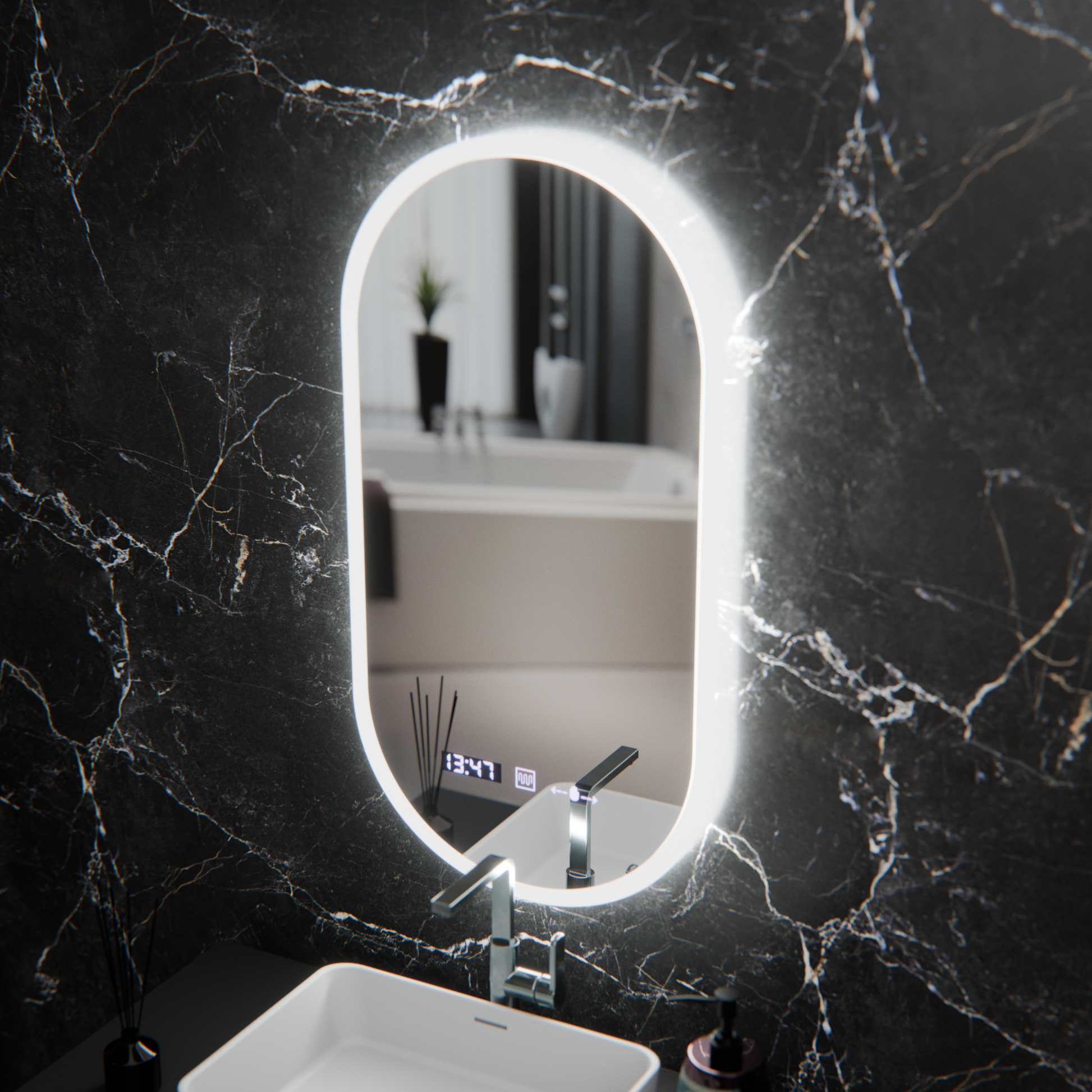 Oválné LED zrcadlo, 50x100cm, Lucia Sensor Marcello, Demister System, Hodiny & Teploměr, Stmívatelné