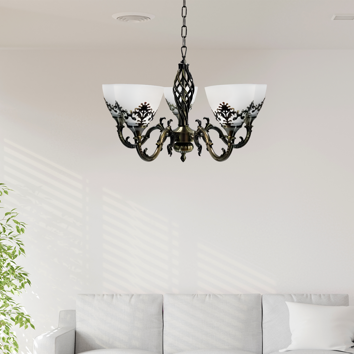 Rustikální chalupa lustru, 5*E27, starožitný bronz, kov a sklo