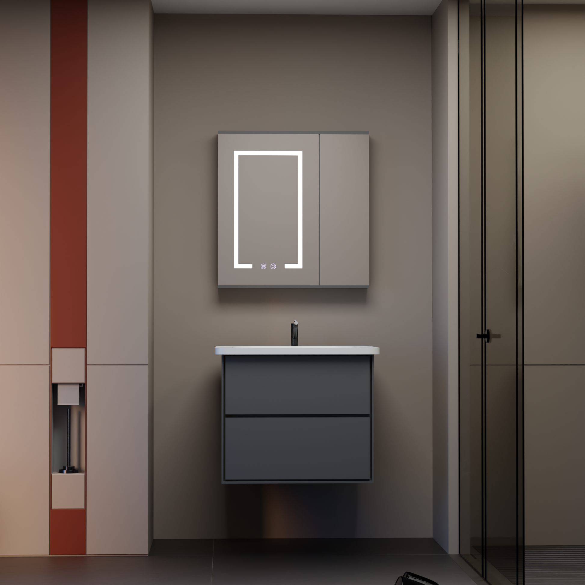 Horní část těla (nábytek s LED zrcadlem): Jedná se o závěsnou skříňku, která obsahuje na přední straně zrcadlo. Systém LED osvětlení je integrován na obrysu zrcadla a promítá světlo ven, čímž přispívá k celkovému prostředí koupelny. Za zrcadlem je úložný prostor pro uspořádání kosmetiky a hygienických potřeb.
