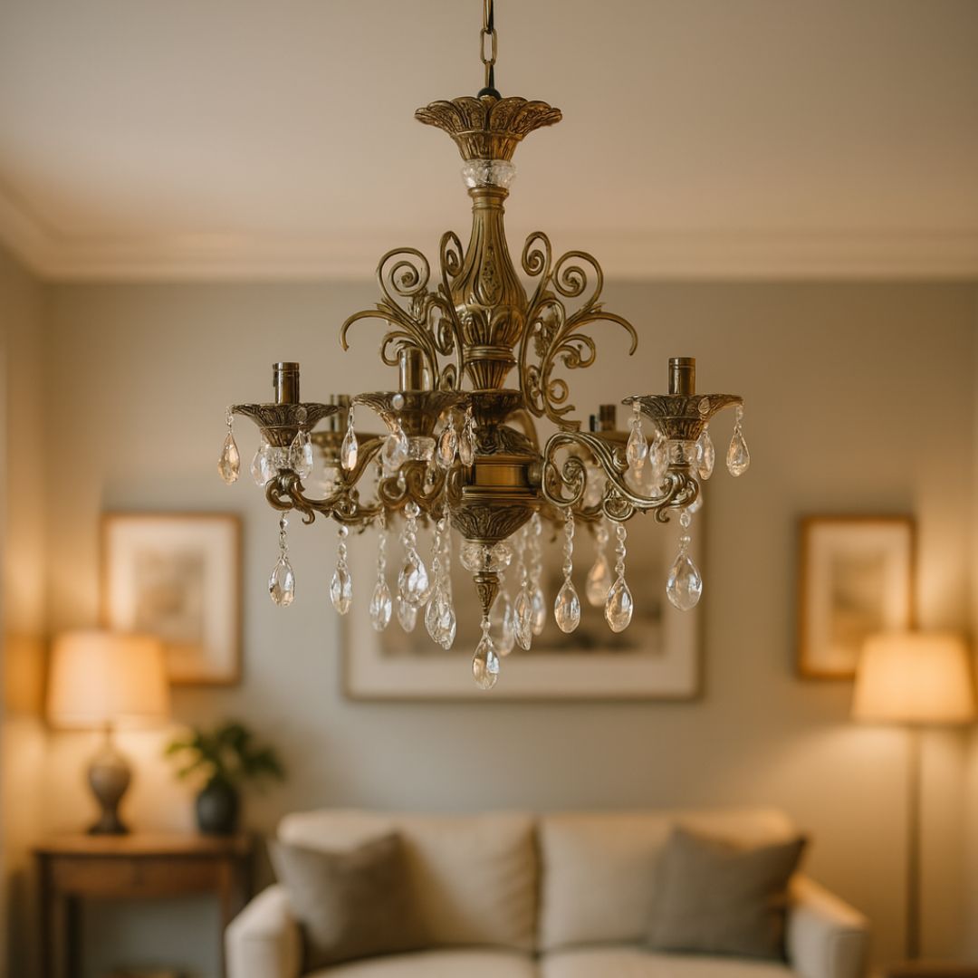 Lustr o průměru 60 cm má propracovanou strukturu s více rameny, každé zdobené křišťálovými přívěsky. Je určen pro montáž na strop a je vhodnou volbou pro velkorysé osvětlení obývacího pokoje nebo ložnice.