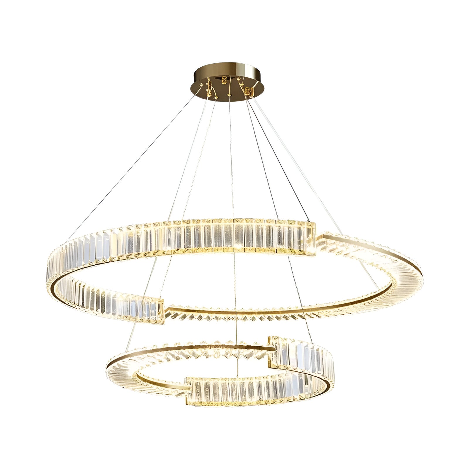Závěsný LED lustr s dálkovým ovládáním a krystalem PRISM REGAL 200W, 2 kruhy, studené/teplé/neutrální světlo, stmívatelný, zlatý, výškově nastavitelný