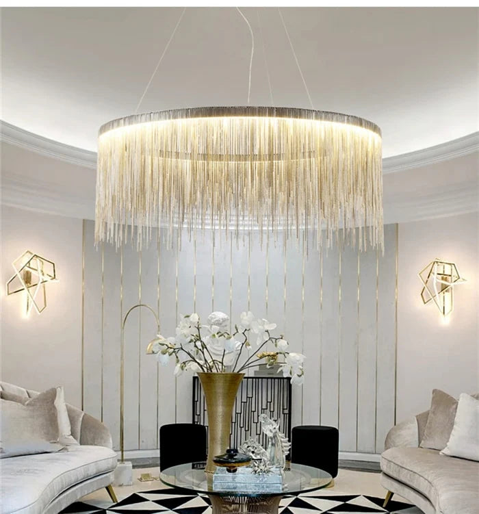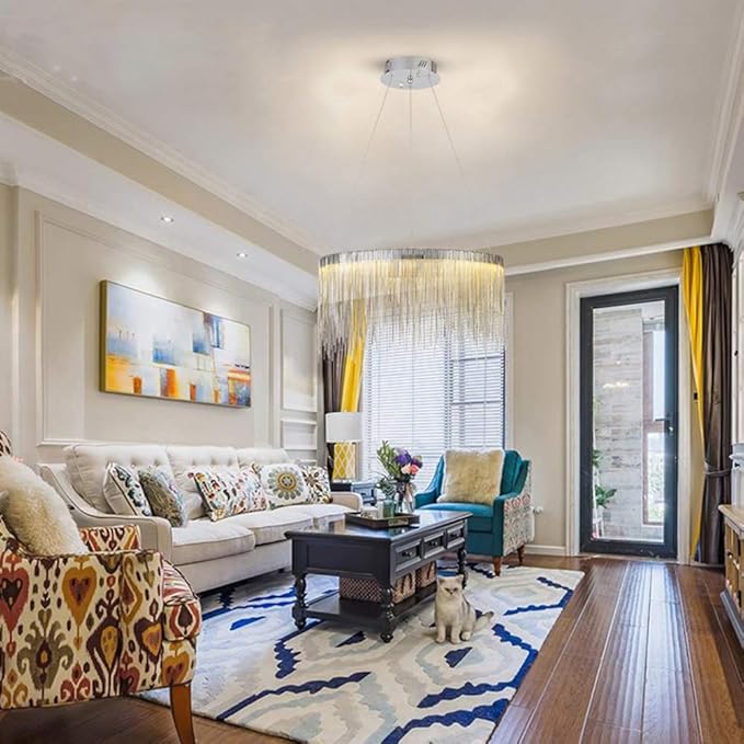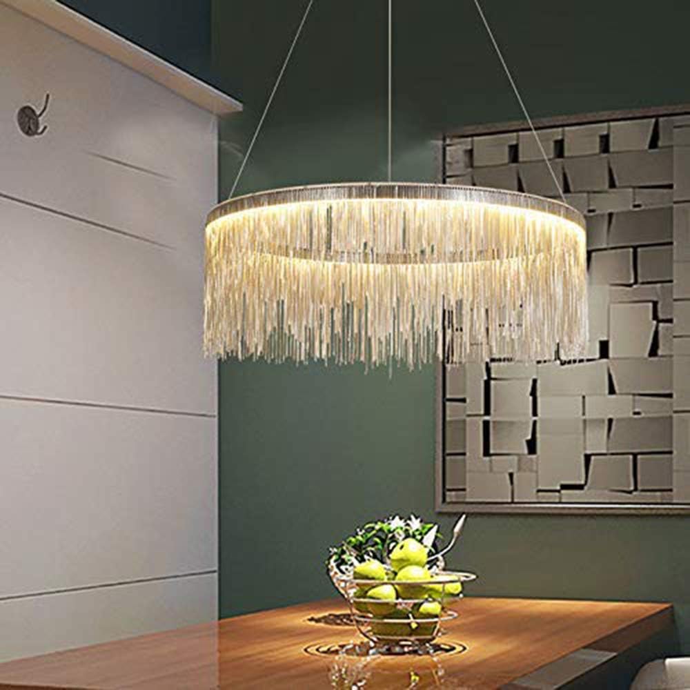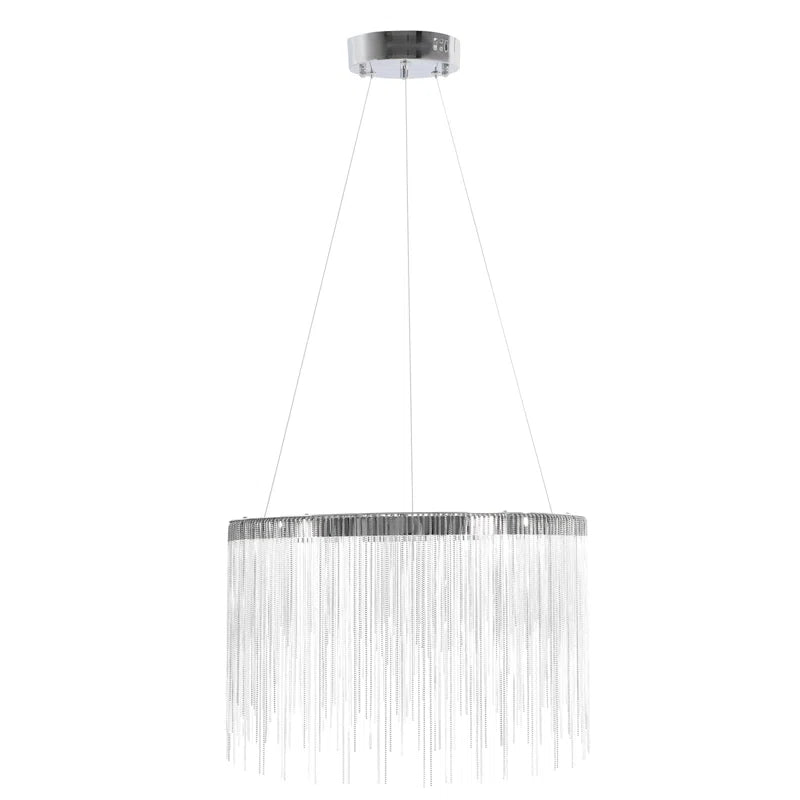 Závěsný model, s průměr 49 cm a výška 120 cm, doporučeno pro jídelna, obývací pokoj nebo ložnice. Kulatá konstrukce, povrchová úprava lesklý chrom a osvětlení s integrovaný LED pásek.
